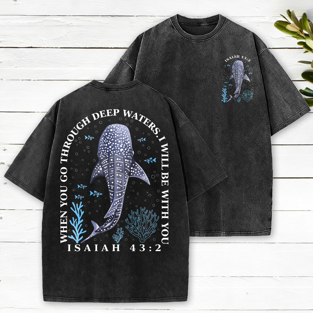 When You Go Through Deep Waters Whale Christian Washed T-Shirt